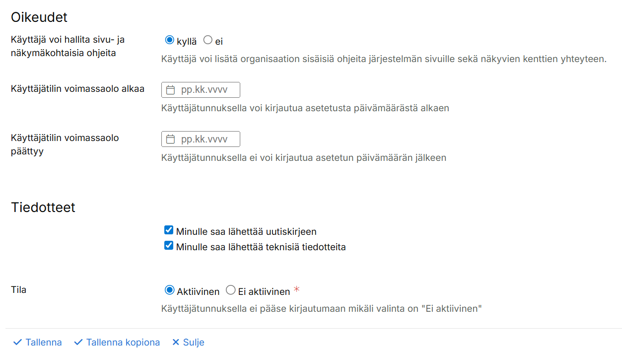 - Tilin käyttöoikeuden voi tarvittaessa rajata antamalla aloitus- ja lopetuspäivämäärät.