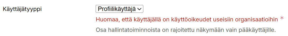 HUOM! Käyttäjätunnuksella voi näkyä myös tieto, että käyttäjällä on käyttöoikeudet useisiin organisaatioihin. Mikäli käyttäjälle on tarvetta antaa oikeudet useampaan organisaatioon, olethan yhteydessä Maxtechin tukeen tuki@maxtech.fi tai soittamalla p. 010 229 6200 (arkisin 8-16).