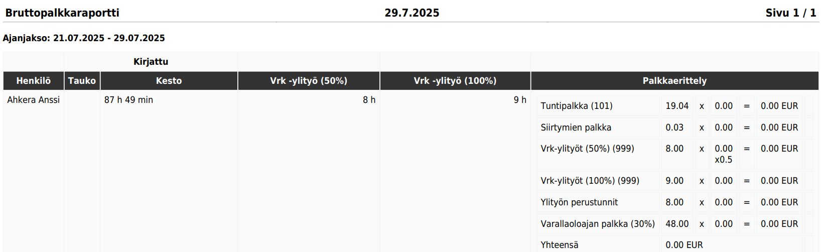 Bruttopalkkaraportin PDF-tulosteessa ei näy palkkaerittely. Saako tätä näkyviin? Kyllä, palkkaerittelyn saa näkymään PDF-tulosteessa. Kun valitset bruttopalkkaraportilta valinnan Näytä yhteenvetonäkymä, palkkaerittely sisältyy myös PDF-tulosteeseen.
