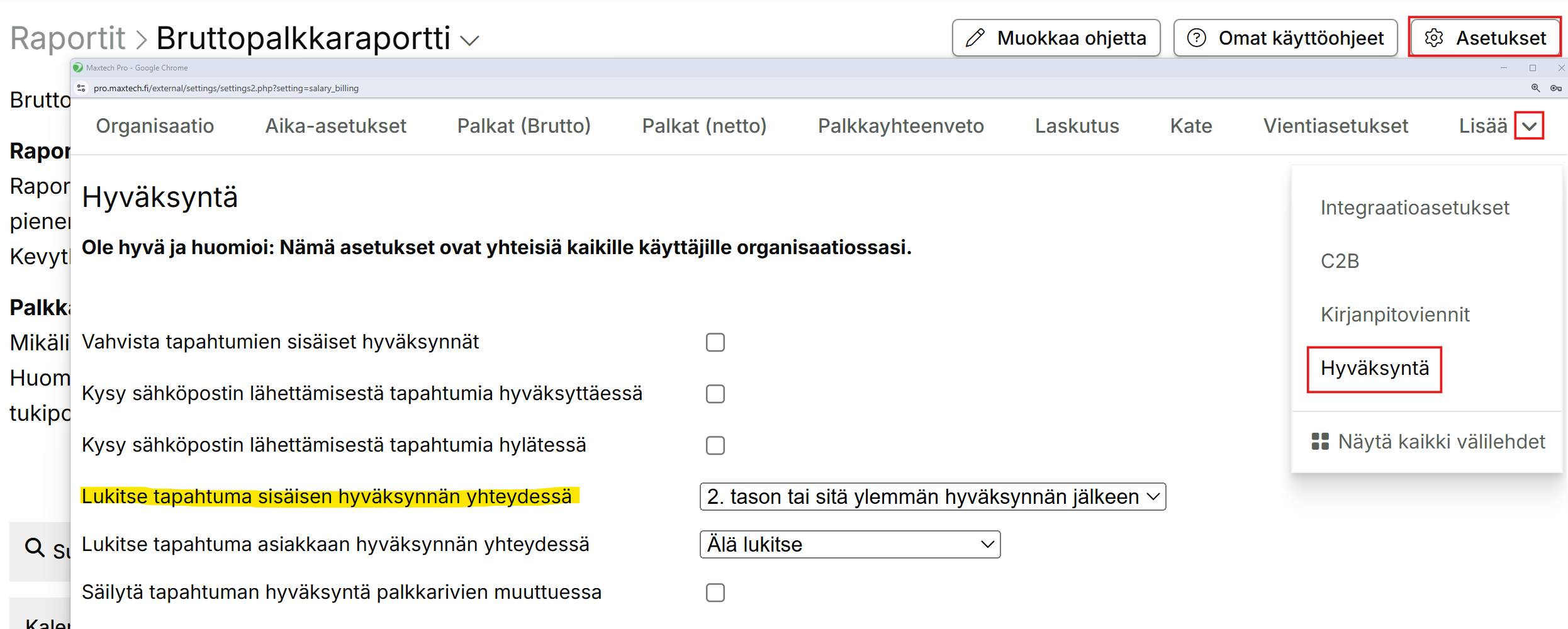 Lukitse tapahtuma samalla, kun poistat lounastauon ja hyväksyt päivän. Tämä voidaan myös automatisoida niin, että tietyn tason hyväksyntä lukitsee tapahtuman. Asetus löytyy Raportit > Bruttopalkkaraportti > Asetukset > Hyväksyntä -välilehti.