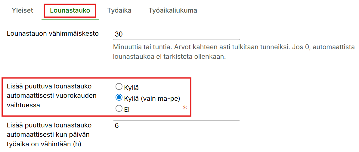 Jos käyttäjällä on päällä asetus, joka lisää puuttuvan lounastauon automaattisesti vuorokauden vaihtuessa, järjestelmä palauttaa tauon ja poistaa hyväksynnän, vaikka tauko olisi manuaalisesti poistettu.