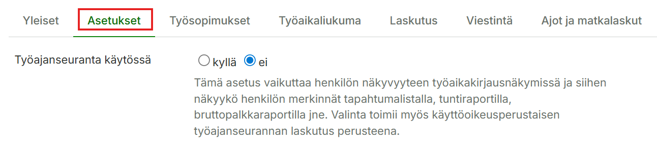 Siirry sivulle Hallinta > Henkilöstö ja avaa henkilö muokattavaksi. Siirry Asetukset -välilehdelle. Onko työajanseuranta käytössä? Tämä asetus vaikuttaa henkilön näkyvyyteen työaikakirjausnäkymissä ja siihen näkyykö henkilön merkinnät tapahtumalistalla, tuntiraportilla tai bruttopalkkaraportilla.