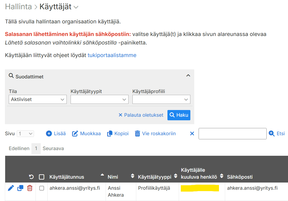 Tarkista ettei henkilöä, käyttäjätunnusta tai käyttäjän tunnistetta ole epähuomiossa siirretty ei aktiiviseksi tai roskakoriin. Palauta tiedot tarvittaessa takaisin aktiiviseksi.