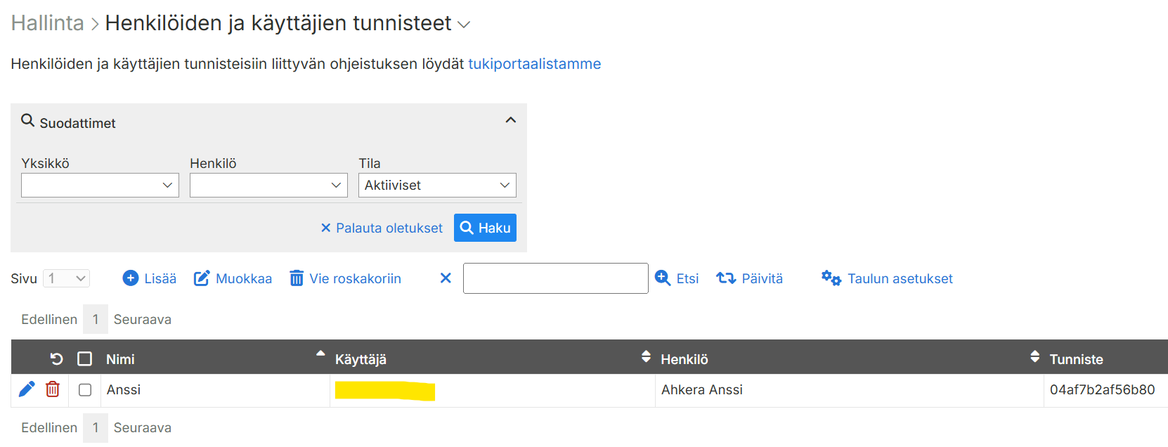 Siirry sivulle Hallinta > Laitteet ja tunnisteet > Henkilöiden ja käyttäjien tunnisteet ja tarkista että tunnisteelle on liitetty käyttäjä- ja henkilötieto paikoilleen. Lisää puuttuvat tiedot tarvittaessa.