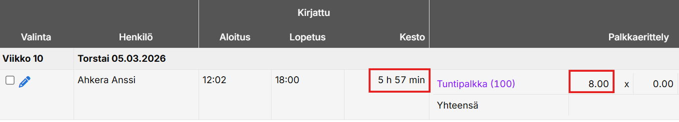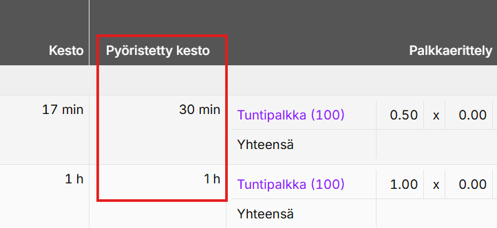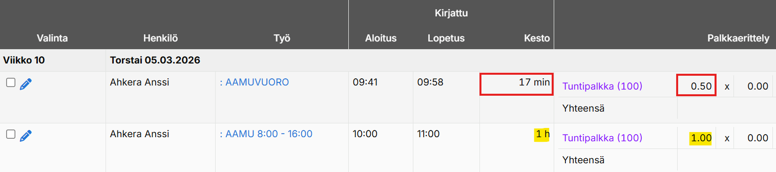 Bruttopalkkaraportin palkkaerittelysarakkeessa näkyvä maksettu määrä voi poiketa alkuperäisen kirjauksen kestosta, mikäli työlle on asetettu pyöristyssääntöjä, tai jos suunnitellulle vuorolle on esimerkiksi asetettu, että työtuntien laskentatapa on suunnitellun mukaan. Tämä tarkoittaa, että järjestelmä laskee palkan automaattisesti määritettyjen sääntöjen mukaan, vaikka työntekijän tekemä leimaus näyttäisikin eri minuuttimäärää.
