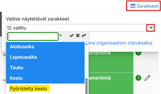 Voit helposti varmistaa, onko käytössä pyöristyssääntöjä, asettamalla Pyöristetty kesto -sarakkeen näkyviin raportille. Siirry raporttinäkymän yläreunassa olevaan Sarakkeet-kohtaan, valitse kyseinen sarake ja tallenna muutos. Vertailu alkuperäisen keston ja pyöristetyn keston välillä paljastaa heti, jos järjestelmä on muokannut aikaa sääntöjen mukaisesti.