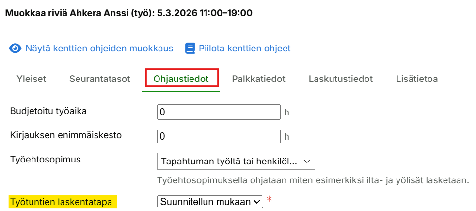 Mikäli ero ei selity pyöristyksillä, syynä voi olla tapahtumalle asetettu laskentatapa. Voit tarkistaa suunnitellun tapahtuman asetukset avaamalla kyseisen tapahtuman muokattavaksi ja siirtymällä Ohjaustiedot-välilehdelle. Täältä näet, mikä laskentatapa työtunneille on asetettu.