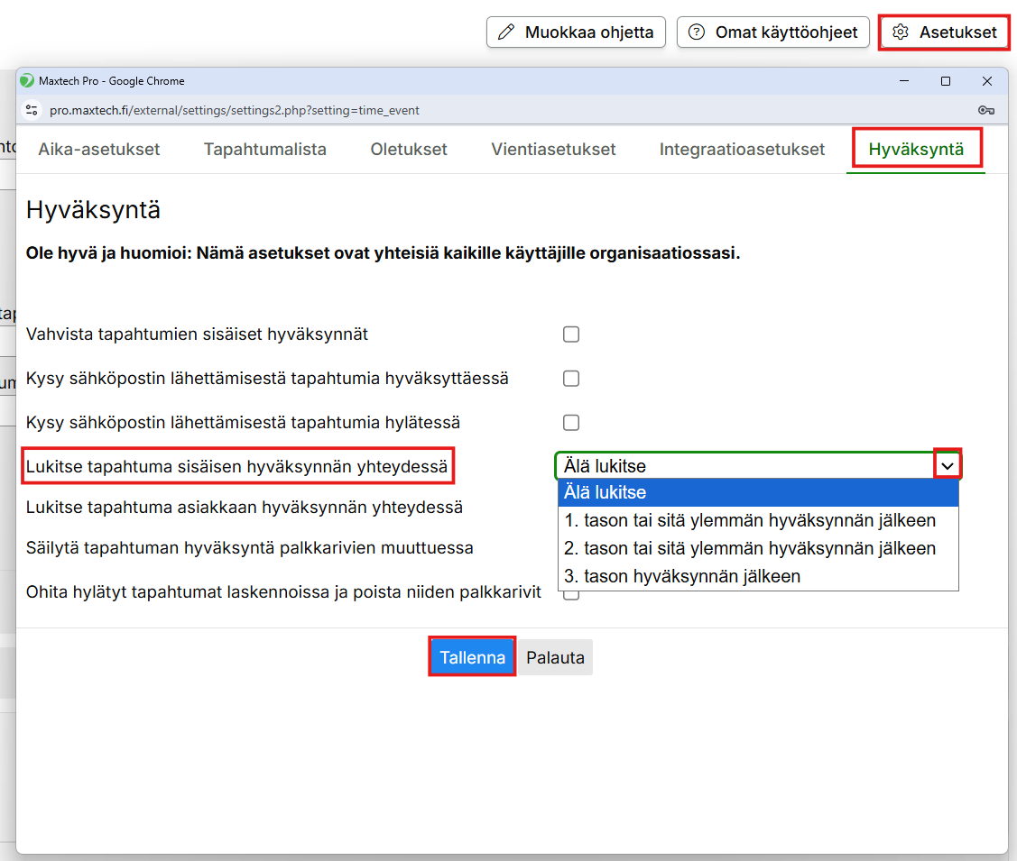 Mistä löydän asetuksen “Lukitse tapahtuma sisäisen hyväksynnän yhteydessä”?