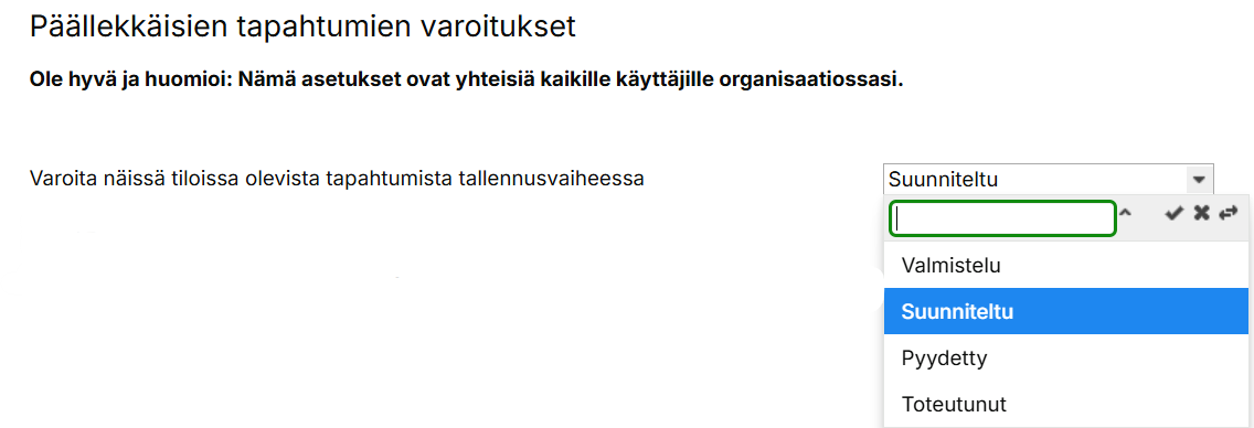 Voinko valita, mistä päällekkäisistä tapahtumista järjestelmä antaa varoituksen tallennettaessa?