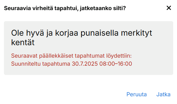 Järjestelmä antaa varoituksen asetusten mukaisesti, mikäli yrität tallentaa päällekkäisiä tapahtumia.