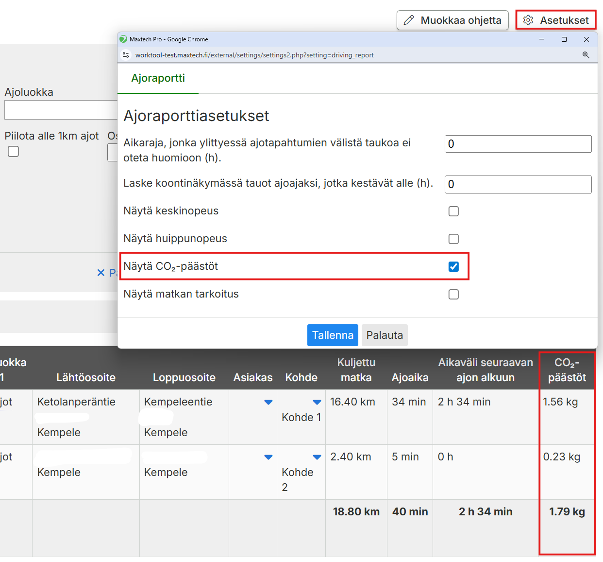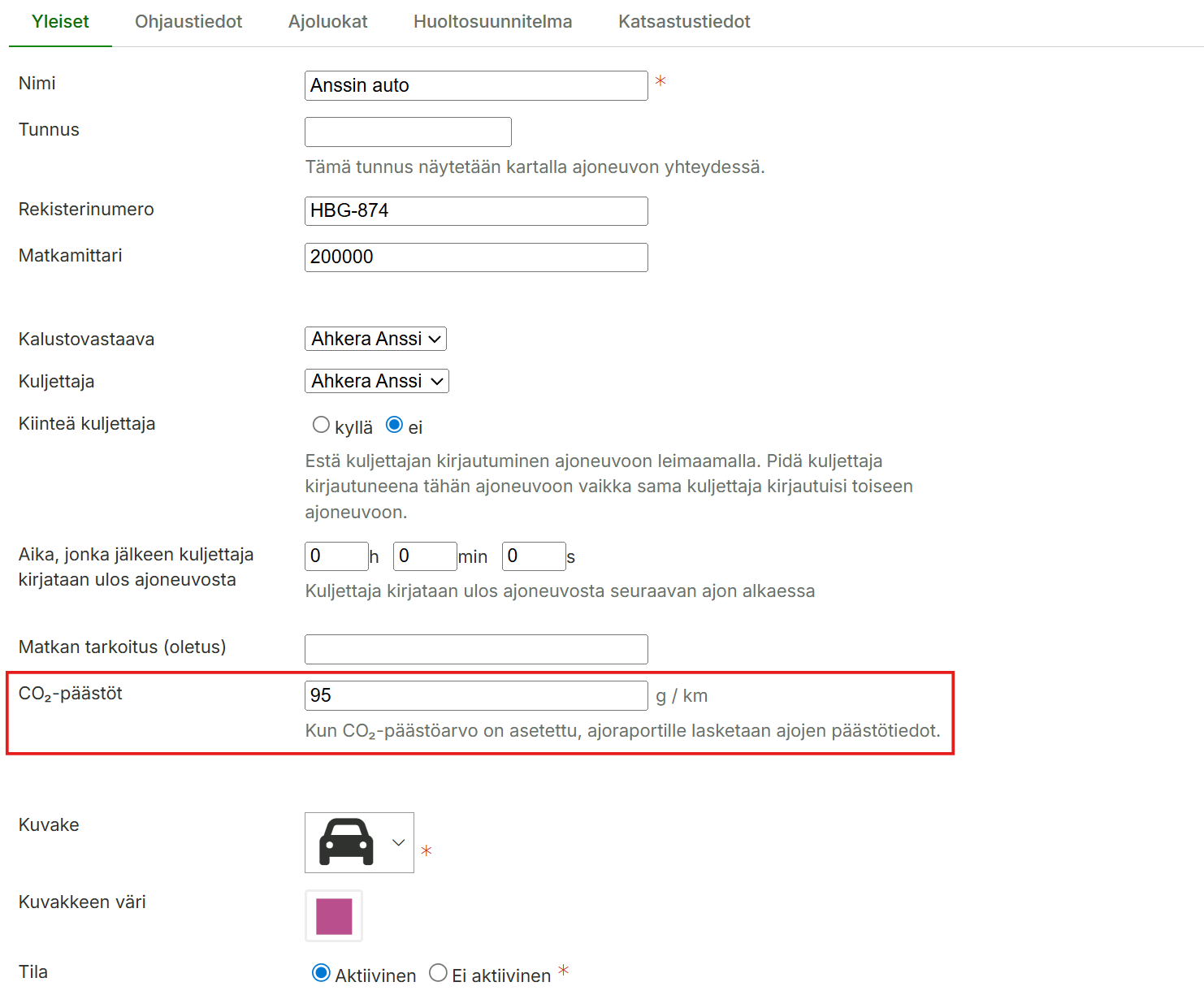 Ajoraportille on lisätty tuki ajoneuvokohtaiselle CO₂-päästöseurannalle. Jatkossa voit asettaa ajoneuvon tietoihin CO₂-päästöarvon, jonka perusteella järjestelmä laskee ajokohtaiset päästöt ja kokonaissumman suoraan ajoraportille. Uusi toiminto automatisoi ympäristöraportointia (ESG) ja poistaa tarpeen manuaaliselle laskennalle. Järjestelmä laskee päästöt dynaamisesti raportin latauksen yhteydessä kaavalla: (Ajokilometrit x päästöarvo g/km) / 1000 = kg CO₂. Kenttä on oletuksena aktivoitu ajoraportin asetuksissa, mutta se edellyttää päästöarvon tallentamista ajoneuvon tietoihin.