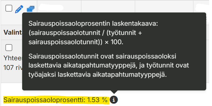 Olemme yhtenäistäneet sairauspoissaoloprosentin laskentatavan kaikilla raporteilla. Aiemmin laskentalogiikka vaihteli riippuen siitä, tarkasteltiinko tietoja yhteenveto- vai yksityiskohtaisella tasolla. Jatkossa järjestelmä käyttää kaikissa näkymissä samaa, tarkempaa kaavaa: (Sairauspoissaolotunnit / (Työtunnit + Sairauspoissaolotunnit)) × 100.