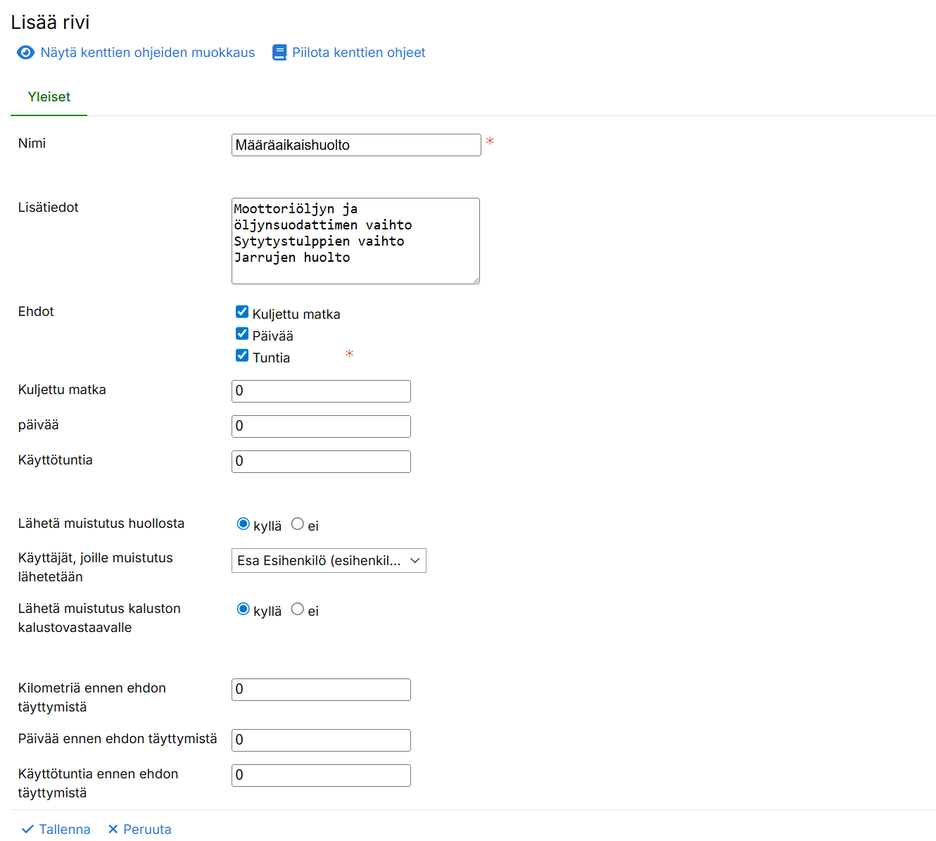 EhdotValitse perusteet, joiden mukaan huolto aktivoituu (esim. kilometrit, kalenteripäivät tai käyttötunnit).