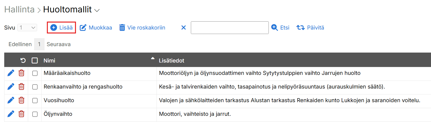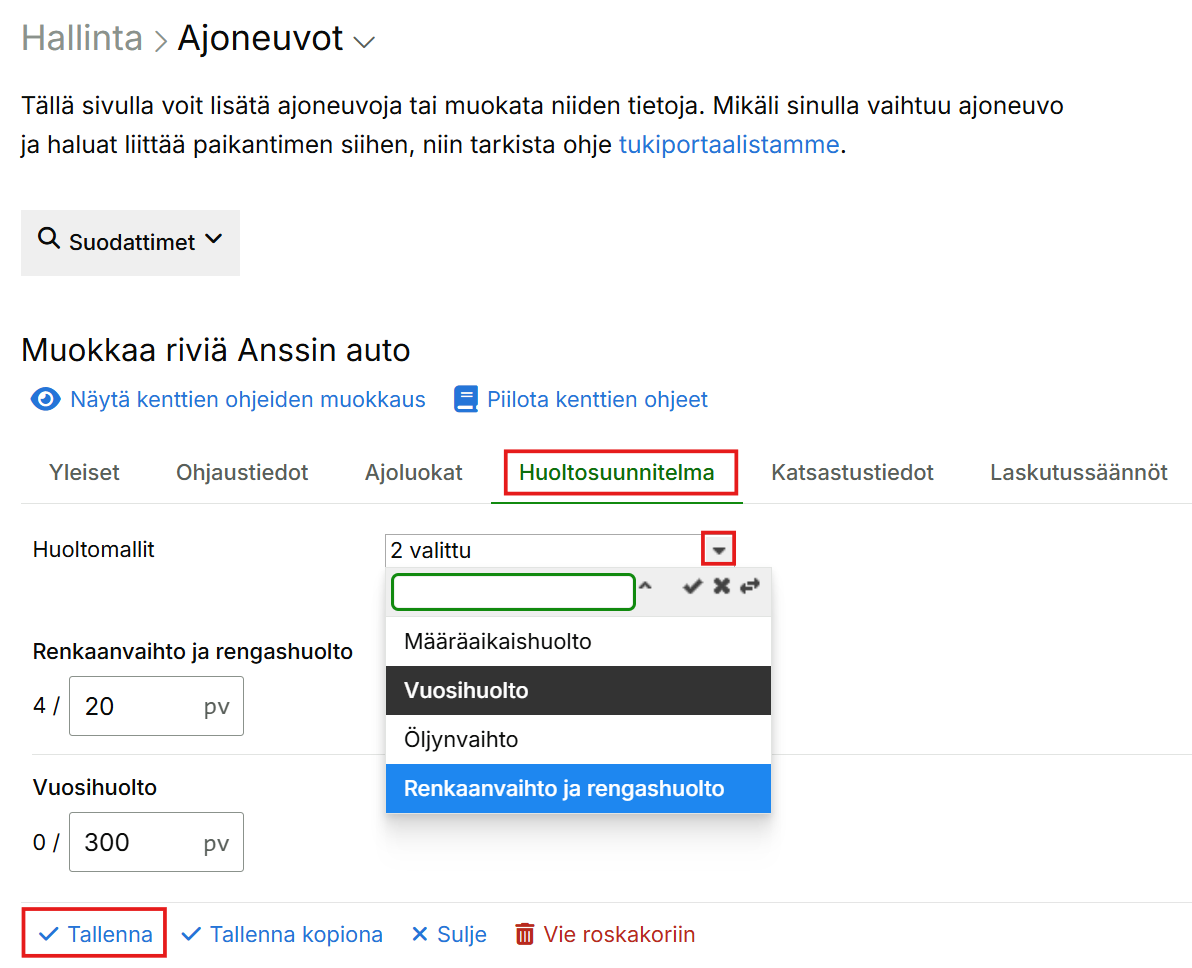 Kun olet luonut huoltomallit, liitä ne ajoneuvoille: Hallinta > Paikannus ja kalustonhallinta > Ajoneuvot. Avaa ajoneuvo, siirry Huoltosuunnitelma-välilehdelle ja valitse sopivat mallit.