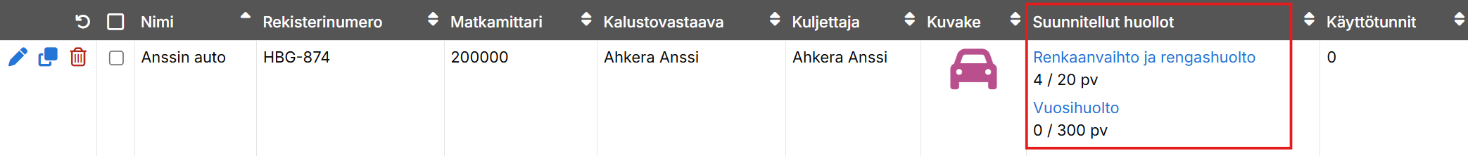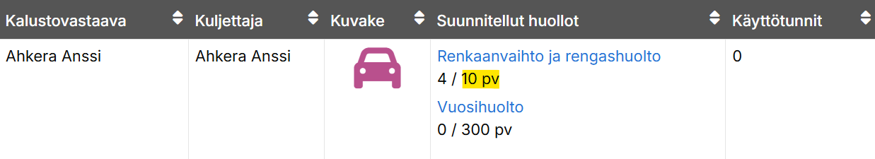 Suunnitellut huollot näkyvät Ajoneuvot-sivun päänäkymässä Suunnitellut huollot -sarakkeessa. Voit tarvittaessa hienosäätää rajoja ajoneuvokohtaisesti suoraan ajoneuvon tiedoissa muuttamatta alkuperäistä yleistä mallia. Muutetut huoltorajat näkyvät ajoneuvon Suunnitellut huollot -sarakkeessa.