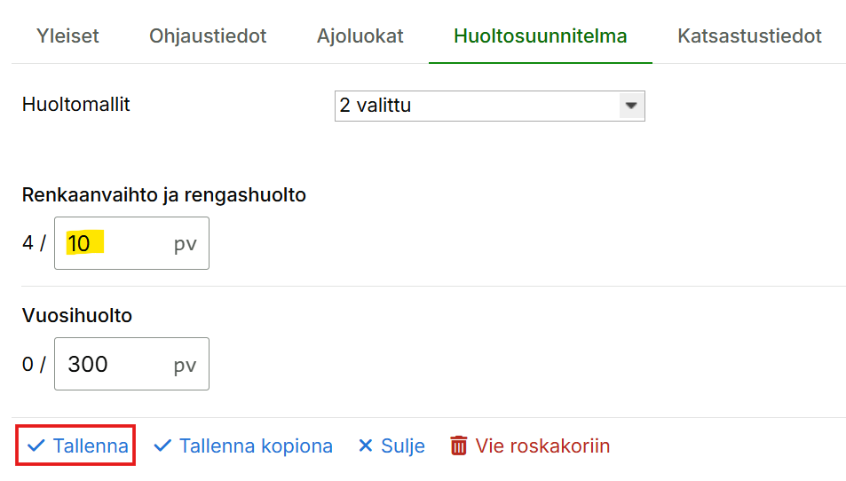 PäivääAseta aikaväli päivinä, jos huolto on sidottu aikaan (esim. 365 päivää).
