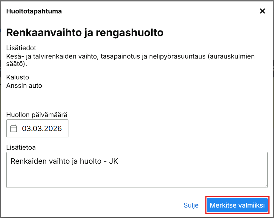 Kun huolto on suoritettu, se tulee kuitata valmiiksi joko sähköpostimuistutuksen linkistä tai Ajoneuvot-sivun päänäkymän linkistä. Linkki avaa Huoltotapahtuma-ikkunan, jossa voit asettaa huollon päivämäärän ja lisätiedot. Kuittauksen jälkeen järjestelmä luo automaattisesti uuden seurannan seuraavalle välille.