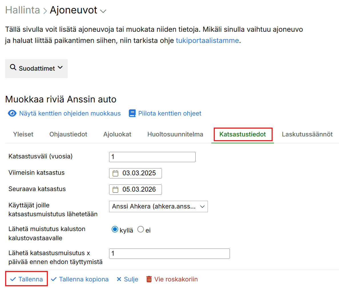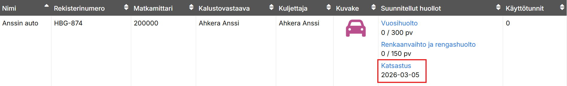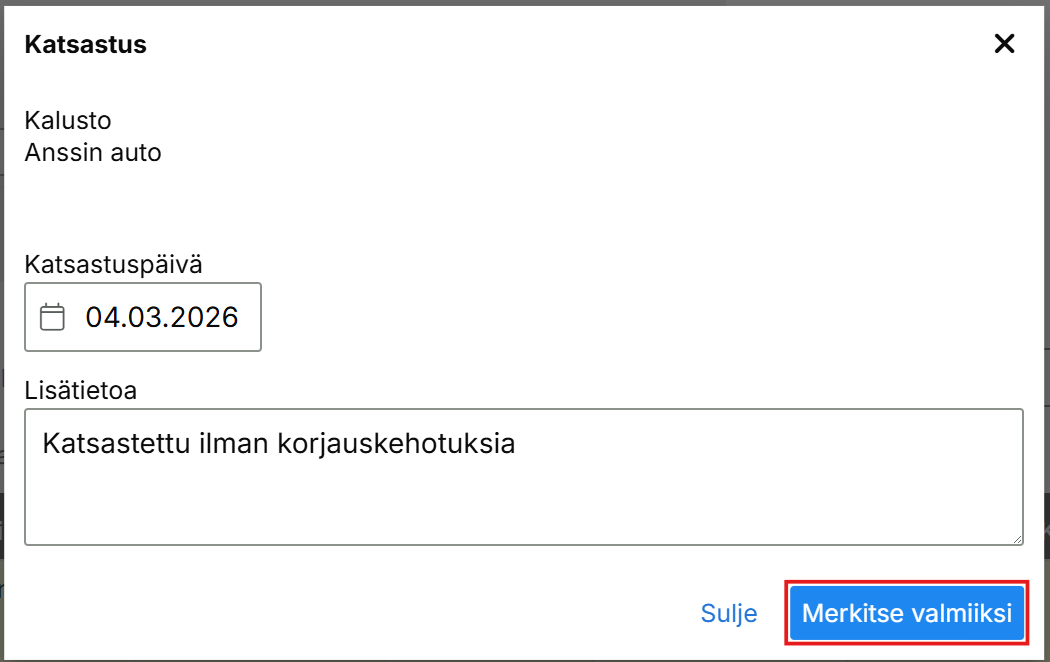 Kun katsastus on suoritettu, kuittaa se valmiiksi joko sähköpostin linkistä tai järjestelmän Suunnitellut huollot -sarakkeesta. Kuittauksen jälkeen automaatti alkaa valvoa seuraavaa katsastusajankohtaa asetusten mukaisesti.