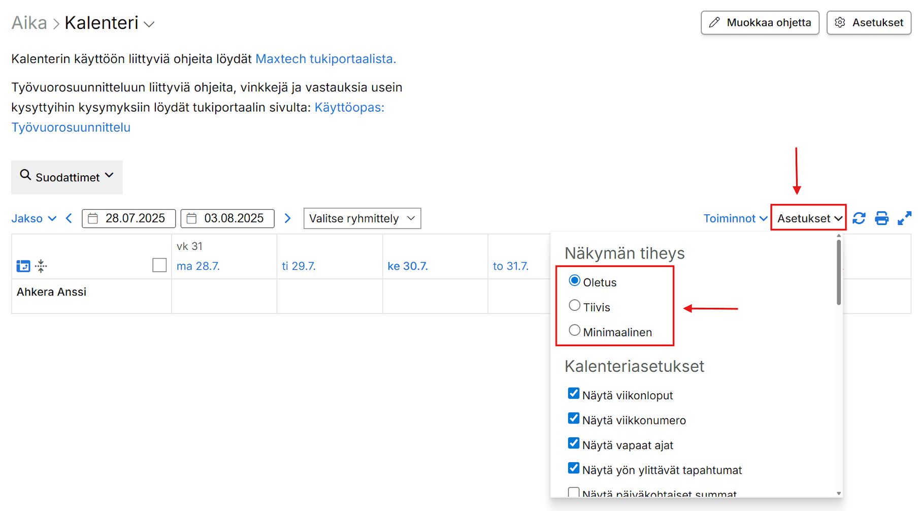 Kalenterinäkymää voi tarvittaessa muokata kompaktimmaksi asetusten kautta. Tiivistetty tai minimaalinen näkymä helpottaa kalenterin käyttöä erityisesti pienemmillä näytöillä tai silloin, kun haluat keskittyä vain olennaisiin tapahtumiin.