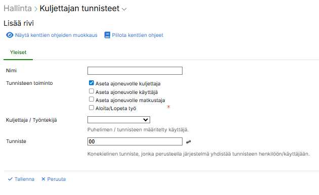 Jotta kuljettajaksi voidaan kirjautua henkilötunnisteella, tulee henkilötunnisteet syöttää kuljettajan tunnisteisiin.