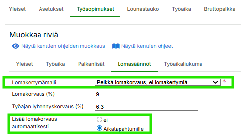 Henkilön työsopimukseen (Hallinta > Henkilöstö > Muokkaa haluttua henkilöä > Työsopimukset > Lomasäännöt) voidaan määrittää maksettava lomakorvaus.