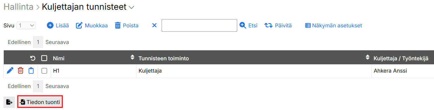 Kuljettajan tunnisteet on mahdollista tuoda myös ulkoisesta tiedostosta. Tuonti tehdään web-käyttöliittymässä klikkaamalla sivun alareunassa olevaa Tiedon tuonti -painiketta. Tuonnissa tulee käyttää ladattavaa mallitiedostoa, jotta tuonti onnistuu.