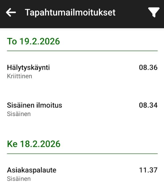 Tapahtumailmoituksia voi tarkastella Tapahtumailmoitukset toiminnossa. Tapahtumia voi suodattaa ( -kuvake) aikavälillä ja tyypillä. Tapahtumailmoituksia voi myös poistaa avaamalla tapahtumailmoituksen ja klikkaamalla Poista-painiketta. Tapahtumailmoituksen Tila-arvoa voi muuttaa tapahtumailmoitusmallin mukaisesti.