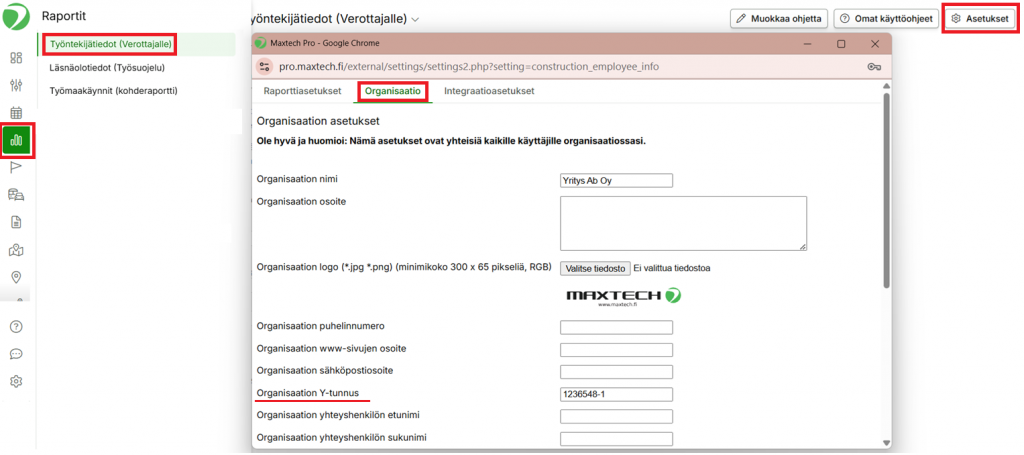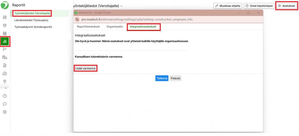 Mene sitten valikossa Raportit > Työntekijätiedot (verottajalle) -sivulla ja klikkaa oikeasta yläkulmasta asetukset- nappia. Tallenna organisaationne y-tunnus Organisaatio-välilehdellä. Mene Integraatioasetukset-välilehdelle ja klikkaa Lisää varmenne – nappia. Syötä siirtotunnus sekä kertakäyttösalasana kirjoitamalla käsin (copy-paste ei toimi) ne kenttiin ja klikkaa Hae varmenne- nappia. Järjestelmä noutaa varmenteen (odota hetki) ja tallentaa sen automaattisesti.
