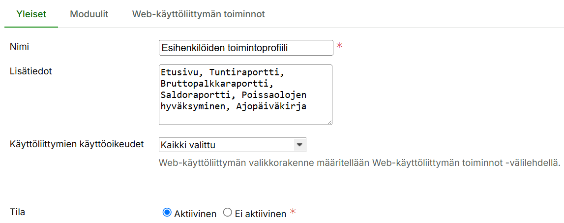 1.2 Yleiset-välilehti: Anna toimintoprofiilille nimi esim. ”Esihenkilöiden toimintoprofiili” ja haluamasi lisätiedot sekä käyttöliittymien käyttöoikeudet.
