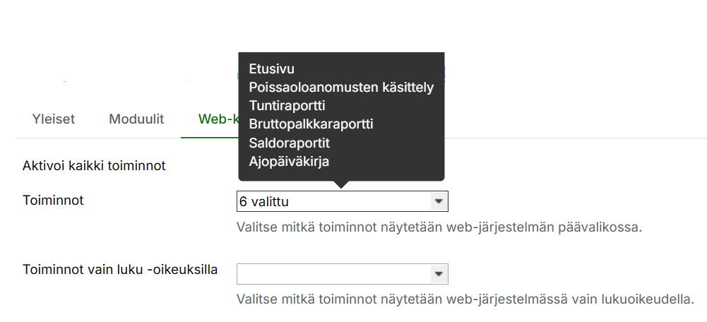 1.4 Toiminnot-välilehdellä näet valikkorakenteen ja voit aktivoida siitä haluamasi toiminnot, jotka tulevat näkyviin web-järjestelmän vasempaan päävalikkoon.