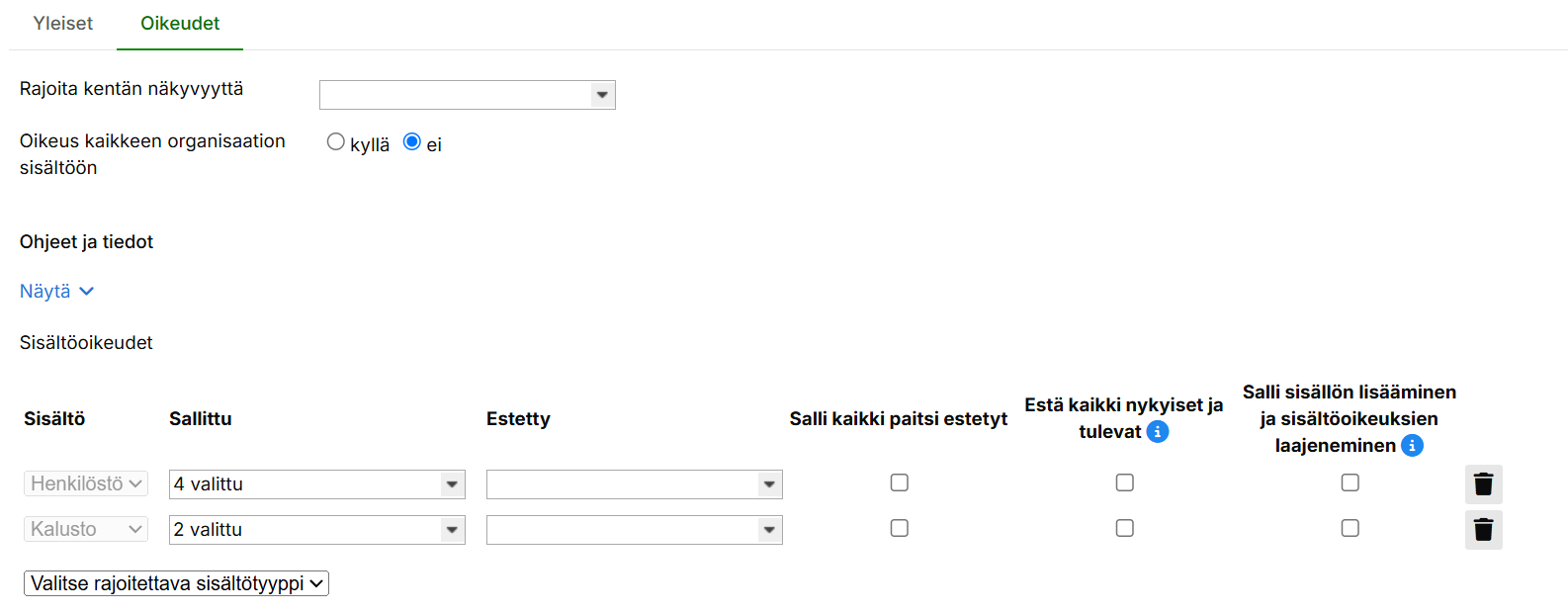 Jos sisältötyypille ei ole valittu sallittuja rivejä eikä asetusta “Estä kaikki nykyiset ja tulevat”, kaikki paitsi estetyiksi valitut rivit ovat sallittuja.