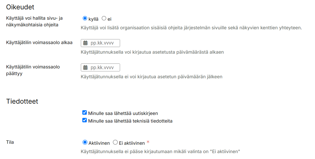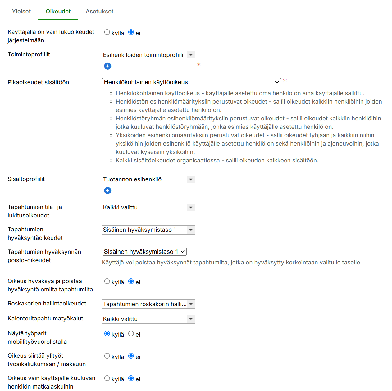 3.3 Oikeudet-välilehti: Valitse toimintoprofiiliksi vaiheessa 1. luotu toimintoprofiili ja vaiheessa 2. luotu sisältöprofiili. Anna lisäksi haluamasi oikeudet mikäli se on tarpeellista.