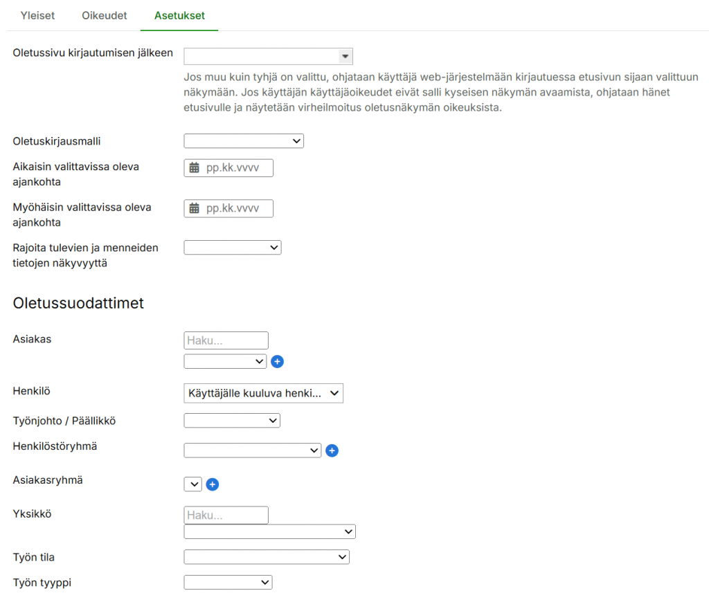 3.4 Asetukset-välilehti: Voit valita oletuksia, jotka ovat käyttäjälle valittuna. Lisäksi voit asettaa päivärajoituksia. Tällä sivulla ei ole välttämätöntä valita mitään.