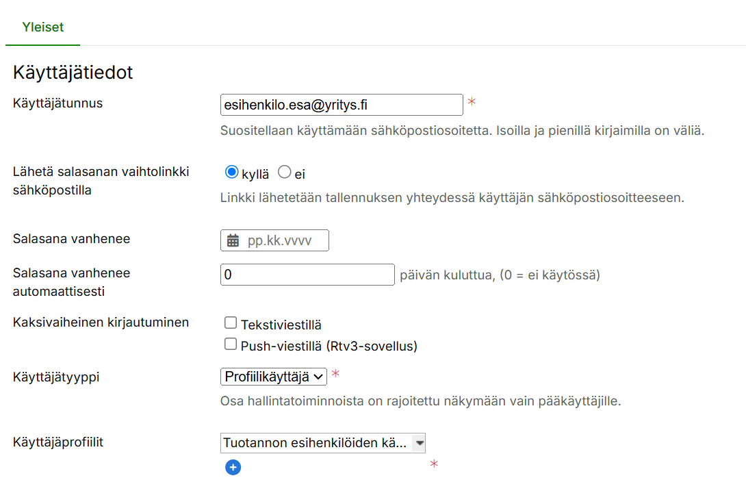 4.2 Anna käyttäjätunnus (suositellaan sähköpostiosoitetta), Lähetä salasanan vaihtolinkki sähköpostilla = Kyllä, valitse käyttäjätyyppi Profiilikäyttäjä sekä valitse vaiheessa 2. lisäämäsi käyttäjäprofiili