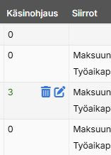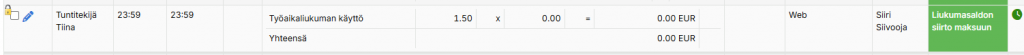 Kun siirto on tehty niin kyseisen päivän Siirrot-sarakkeessa näkyy määrä paljonko tunteja on siirretty. Lisäksi, kun hiiren vie soluun niin siirron voi tarvittaessa poistaa klikkaamalla roskakori-painiketta.