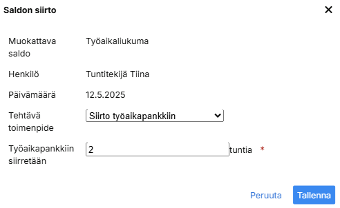 Mikäli siirrät saldoa työaikapankkiin niin valitse dialogissa määrä ja klikkaa Tallenna-painiketta.