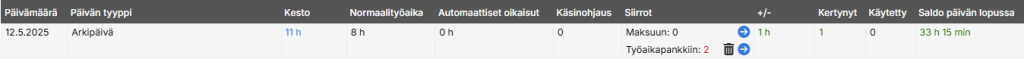 Raportilla näkyy päivän kirjatut tunnit, joita verrataan normaalityöaikaan. +/- -sarakkeessa näkyy edellä mainittujen erotus. Normaalityöajan ylittävät tunnit näkyvät Kertynyt-sarakkeessa ja alittavat Käytetty-sarakkeessa. Saldo päivän lopussa -sarakkeessa näytetään päiväkohtainen vaikutus kokonaissaldoon.