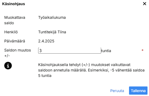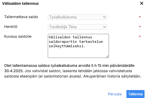 Valitse henkilö(t) kenelle haluat tallentaa saldon. Valitse päivämäärä ja lisää Saldo-kenttään määrä. Laskenta tehdään annetusta päivämäärästä ja saldosta eteenpäin.