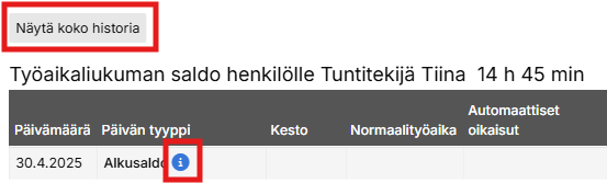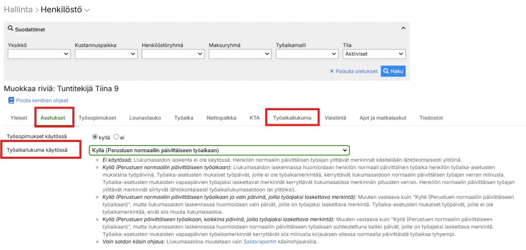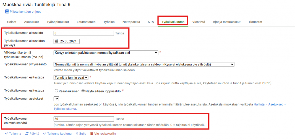 Jos henkilöllä on työaikaliukuma käytössä, alkusaldo ja alkusaldon päiväys voidaan asettaa työaikaliukuma-välilehdeltä.