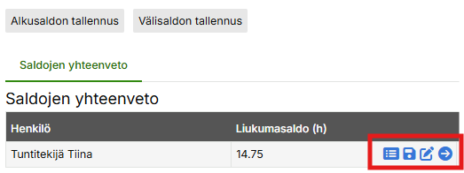 Alkusaldon tallennuksen, käsinohjauksen tai siirtämisen voi tehdä myös saldoraportit sivun päänäkymässä klikkaamalla haluttua kuvaketta.