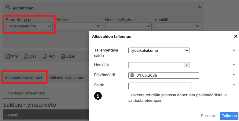Alkusaldon tallennus usealle henkilölle saldoraportin kautta