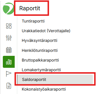 Henkilöstön saldoja voidaan seurata ja hallita kohdasta Raportit > Saldoraportit: