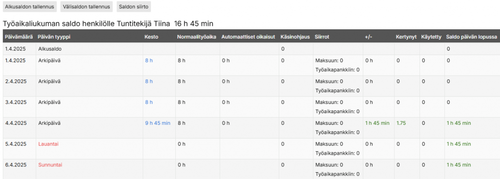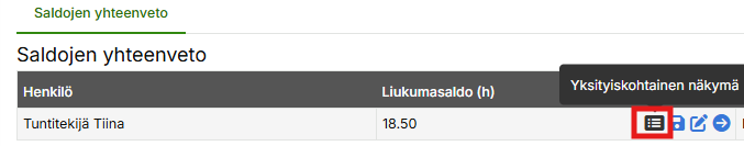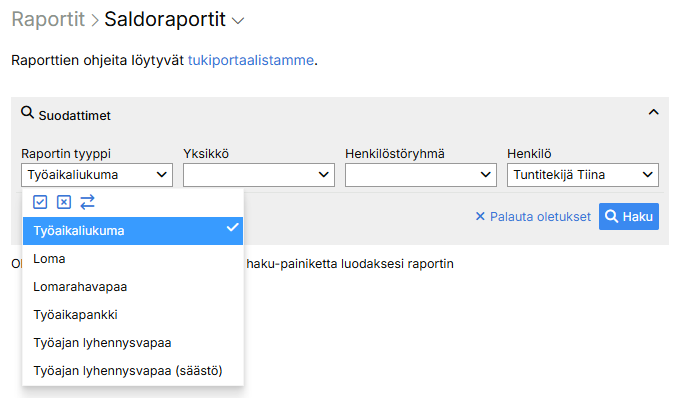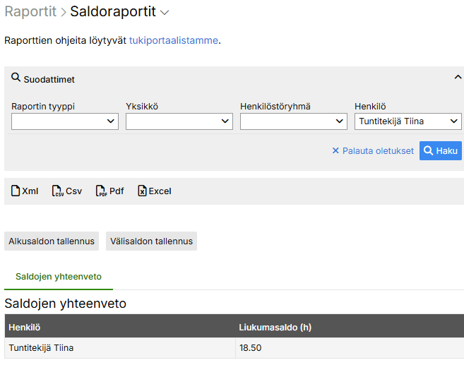 Kun henkilön asetukset on laitettu kuntoon, henkilön saldo on tarkasteltavissa saldoraportilla.