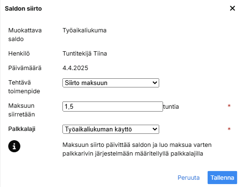 Mikäli siirrät saldoa maksuun niin valitse dialogissa määrä ja palkkalaji, joka muodostuu tapahtumalle. Klikkaa lopuksi Tallenna-painiketta.