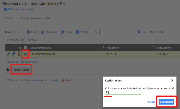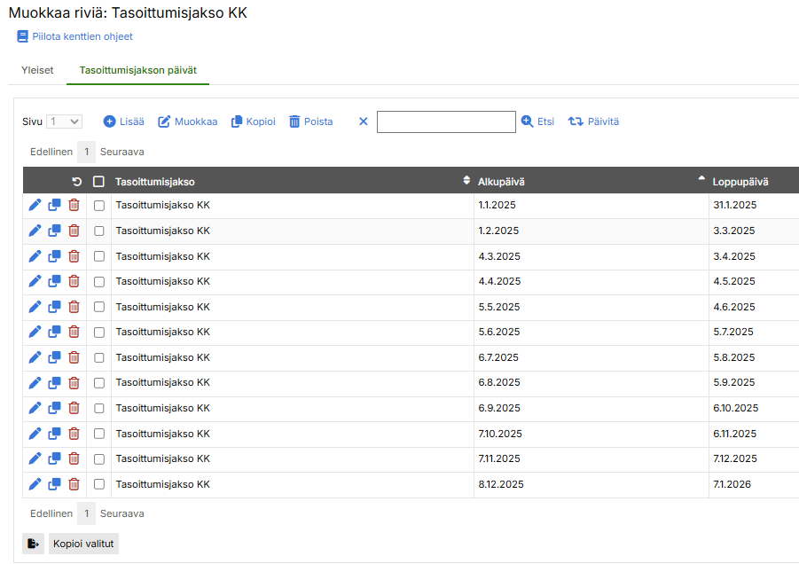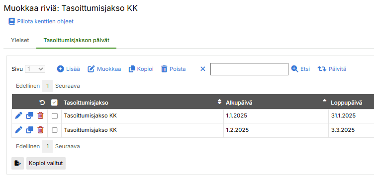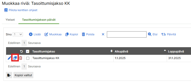 Kun olet määrittänyt yhden tasoittumisjakson, klikataan kyseinen tasoittumisjakso aktiiviseksi, jonka jälkeen klikataan ”Kopioi valitut” -nappia.