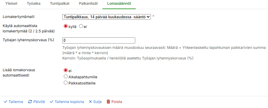 Lomasäännöt-välilehdellä voidaan määritellä Työajan lyhennyskorvaus (%) asetus. Työajan lyhennyskorvauksen määrä lasketaan seuraavan kaavan mukaisesti: