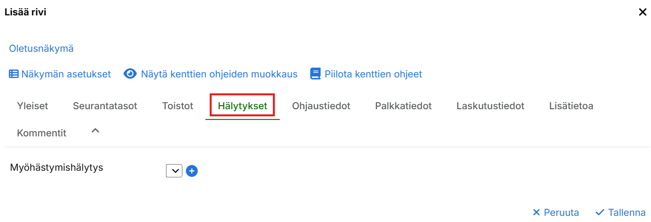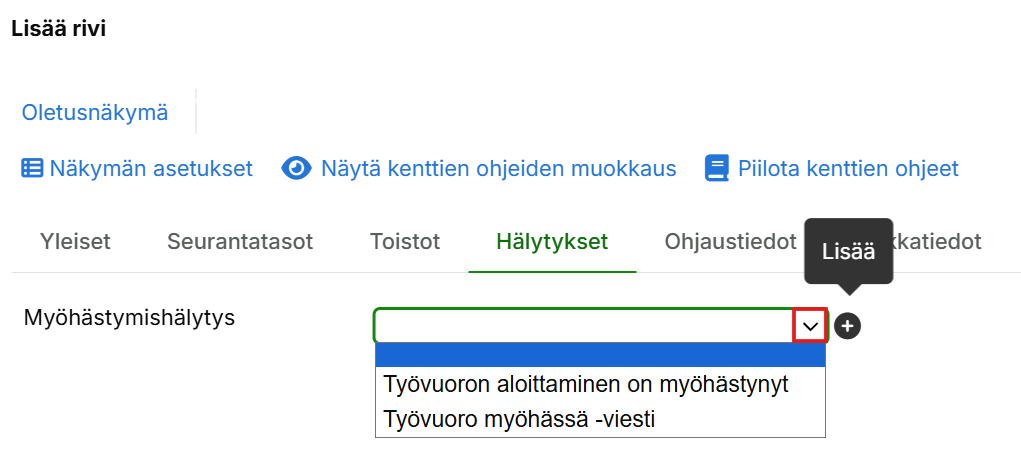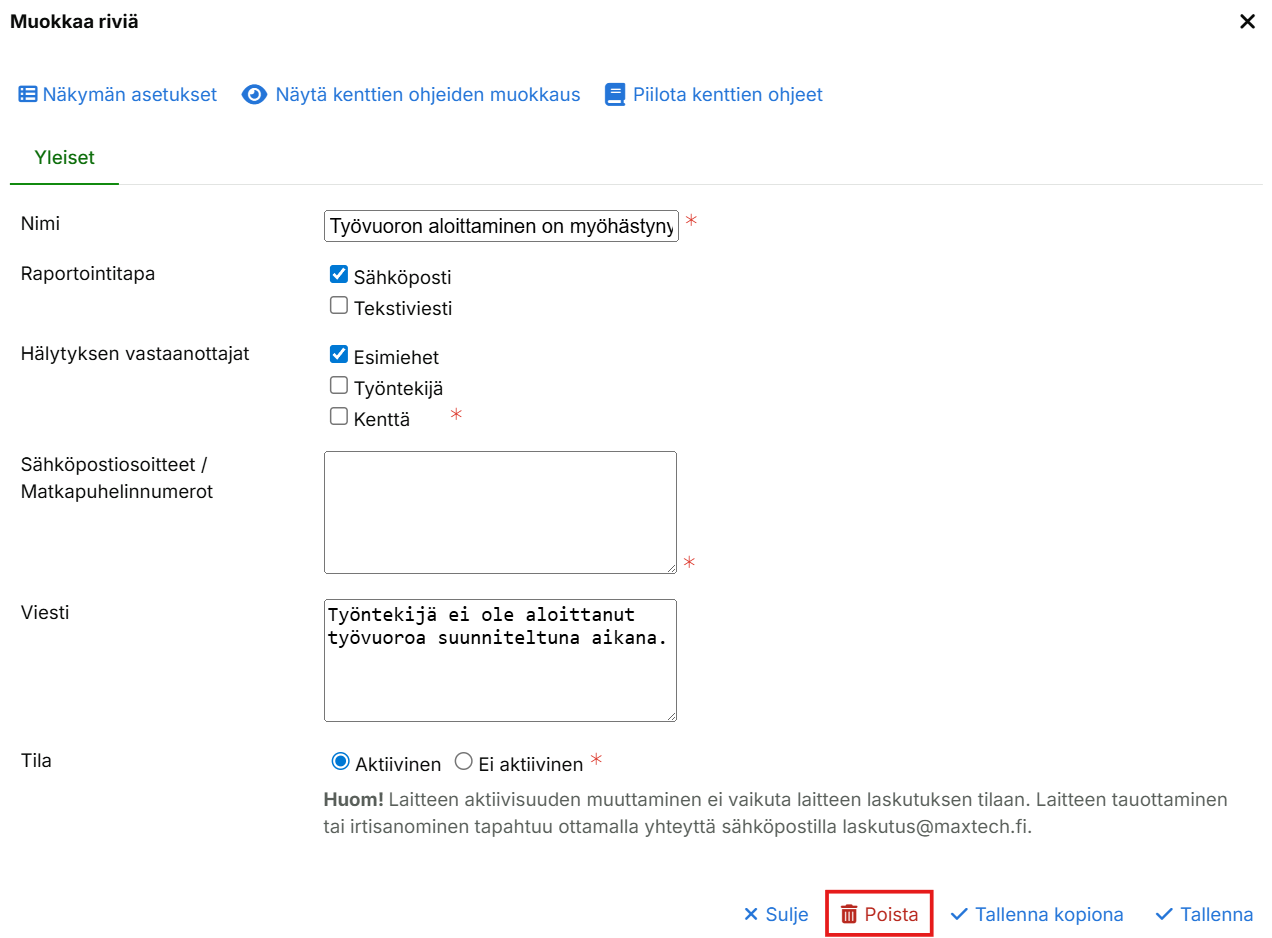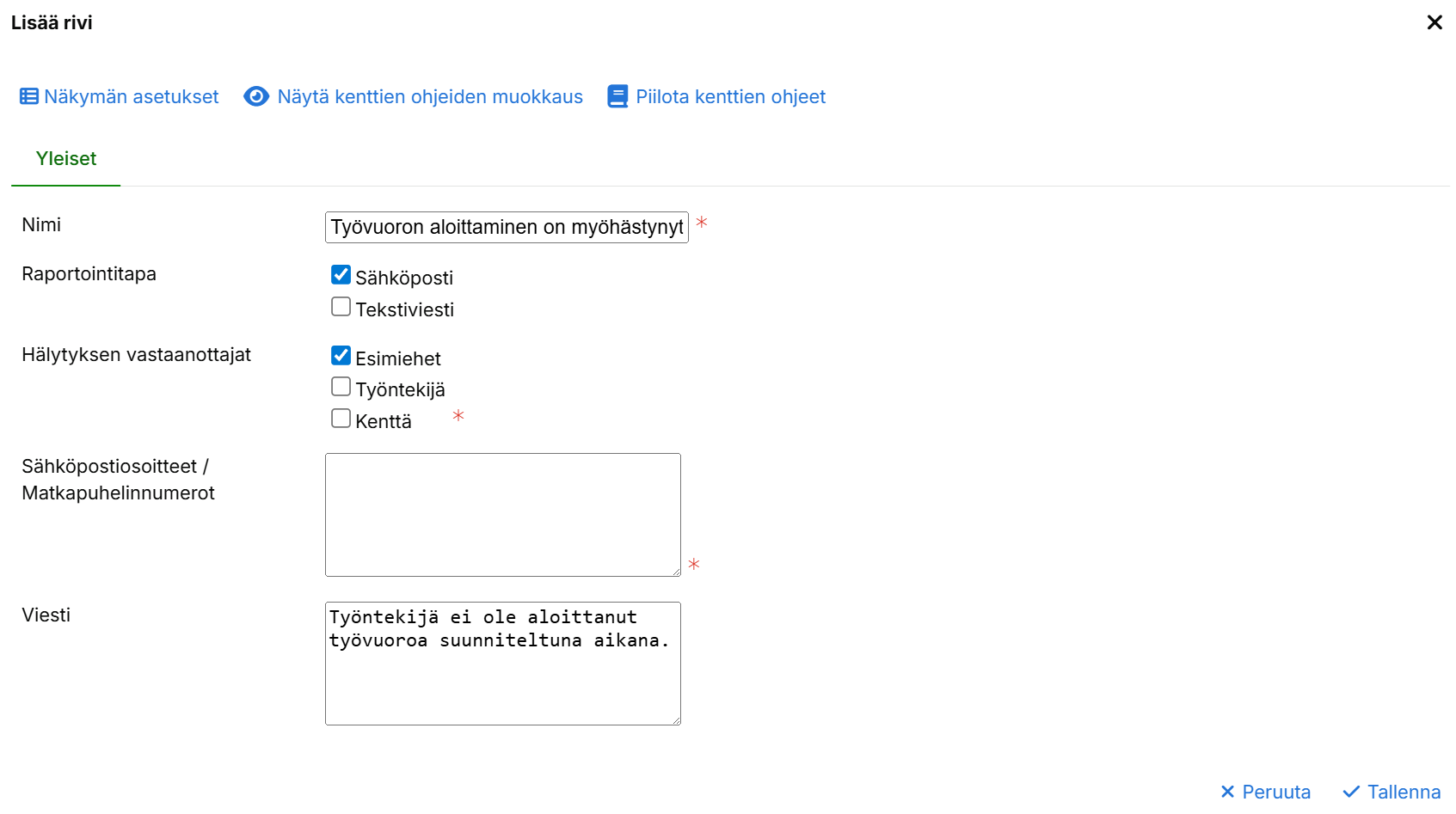 Tapahtuman lisäyksen yhteydessä on mahdollista asettaa myöhästymishälytys. Kun hälytys on aktivoitu, järjestelmä lähettää ilmoituksen määriteltyyn sähköpostiosoitteeseen, jos työntekijä ei ole aloittanut työvuoroaan suunnitellun ajan mukaisesti.