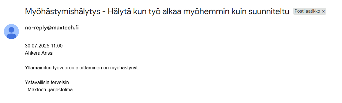 Tämä toiminto sisältyy Työvuorot™-tuotteen maksuttomiin lisämoduuleihin. Jos haluat ottaa myöhästymishälytykset käyttöön organisaatiossanne, olethan yhteydessä Maxtechin käyttötukeen tuki@maxtech.fi.