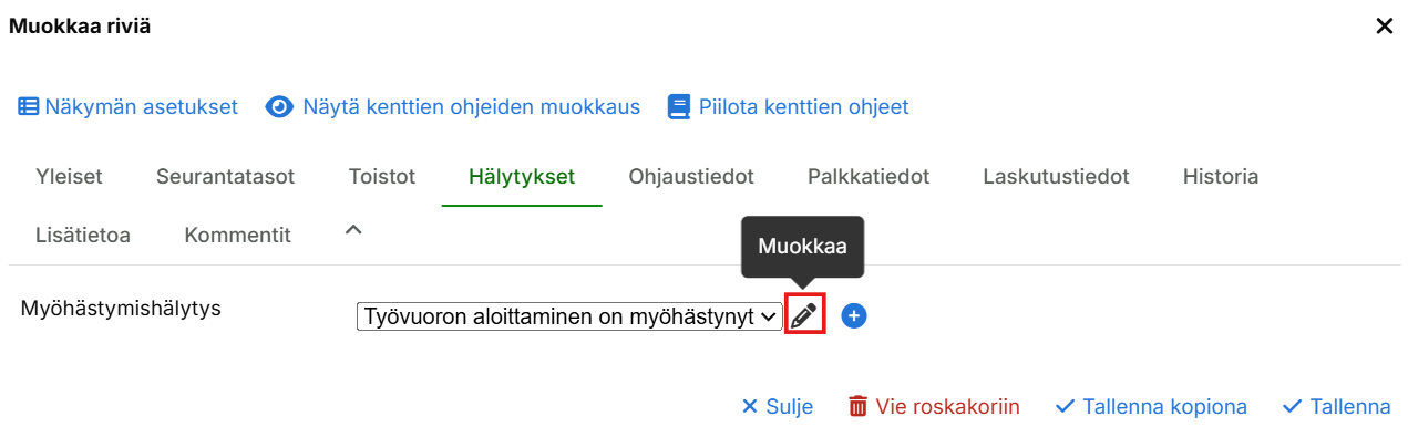 5. Voit muokata tai poistaa myöhästymishälytyksiä klikkaamalla -painiketta.