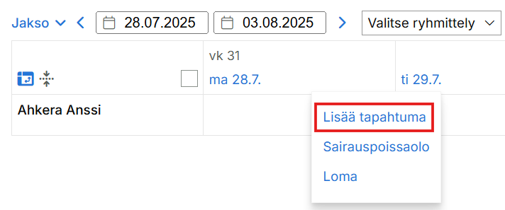 Kalenterissa vuoron lisääminen onnistuu viemällä hiiri henkilön ja päivän kohdalle, jolle tapahtumaa ollaan lisäämässä, ilmestyy + -ikoni.